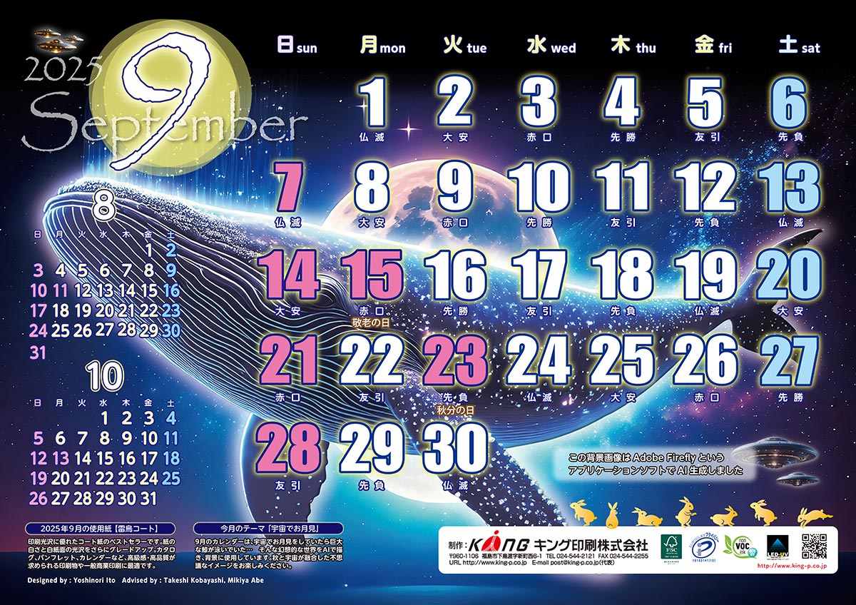 9月のカレンダーは、宇宙でお月見をしていたら巨大な鯨が泳いでいた…